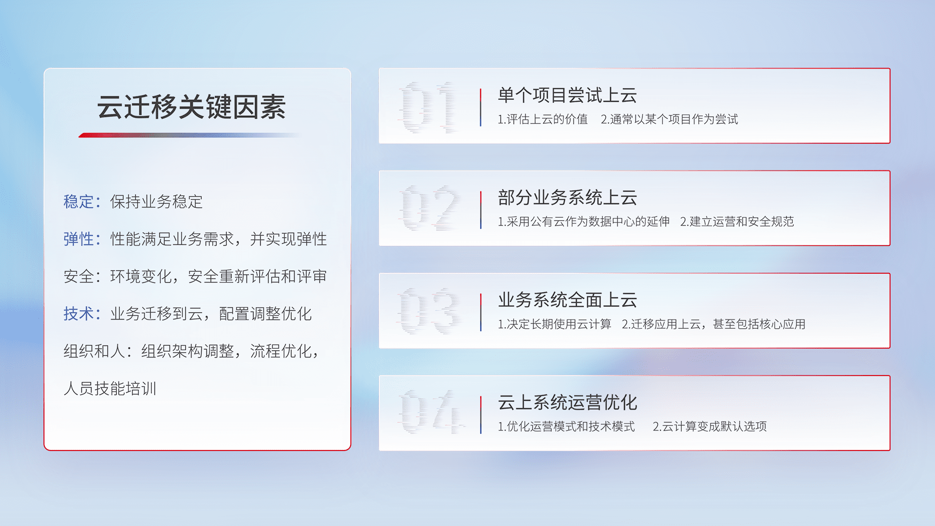 结合实际业务,,从规划设计、、、、云平台选型、、云原生改造、、数据迁移、、、集成交付,,迁移全过程为客户识别最佳上云路径,,,,做好风险识别管理,,设计网络架构、、、身份权限、、、安全审计合规、、、操作审计、、日志审计、、、监控告警策略、、、多站点容灾设计等,,,对云上基础设施进行整体规划,,,,提升IT治理水平,,,,以满足弹性、、、、高可用、、高性能的需求。。。。